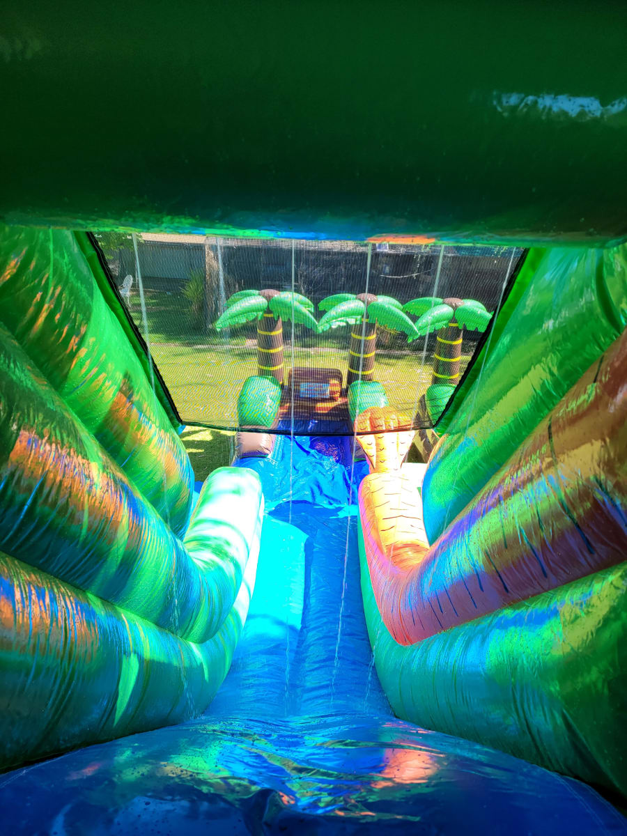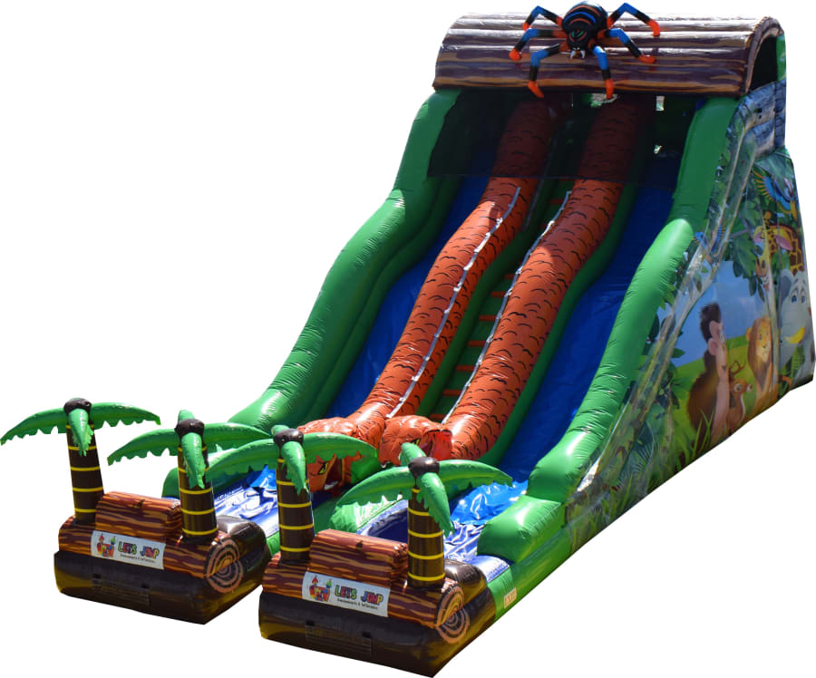 Double Lane Jungle Kingdom Water Slide Towering dual-lane slide with jungle styling, inflatable spider, and four palm trees. Built for high-impact summer events, this unit delivers serious visual punch and fast-paced fun for all ages.