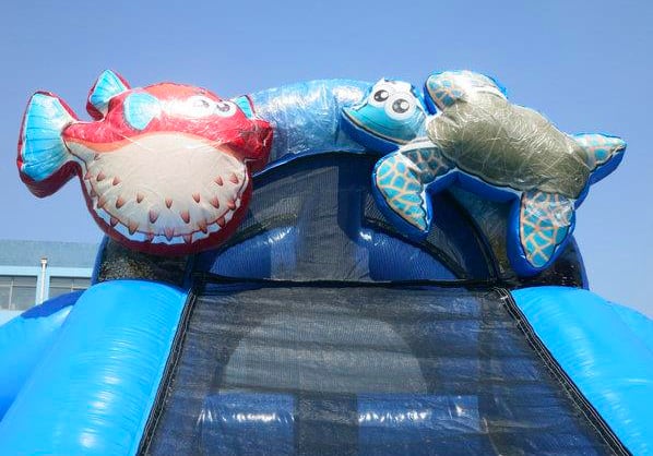 Shark Double Lane Water Slide Unique dual-lane slide with bold shark styling—built for speed, colour, and crowd appeal. A standout choice for birthdays, school events, and summer activations across Adelaide.