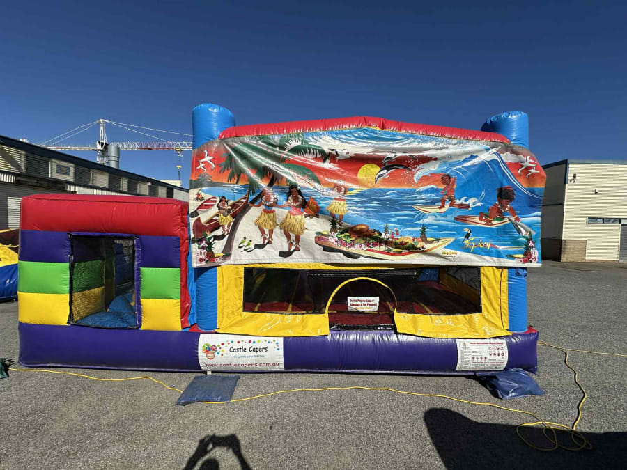 The Surf’s Up Multi Challenge Combo is a high-impact inflatable perfect for birthdays, school events, and OSHC programs across the Hills, Mount Barker, southern suburbs, and Murray Bridge. With pop-up obstacles, a wide jumping area, and a large slide, it delivers non-stop movement and excitement in a bold, oversized footprint.