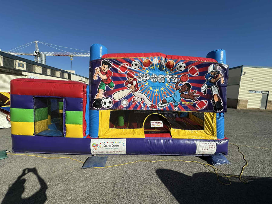The Sports Multi Challenge Combo is a high-energy inflatable designed for birthdays, school events, and OSHC programs across the Hills, Mount Barker, southern suburbs, and Murray Bridge. With pop-up obstacles, a wide jumping area, and a large slide, it keeps kids moving and engaged from start to finish.