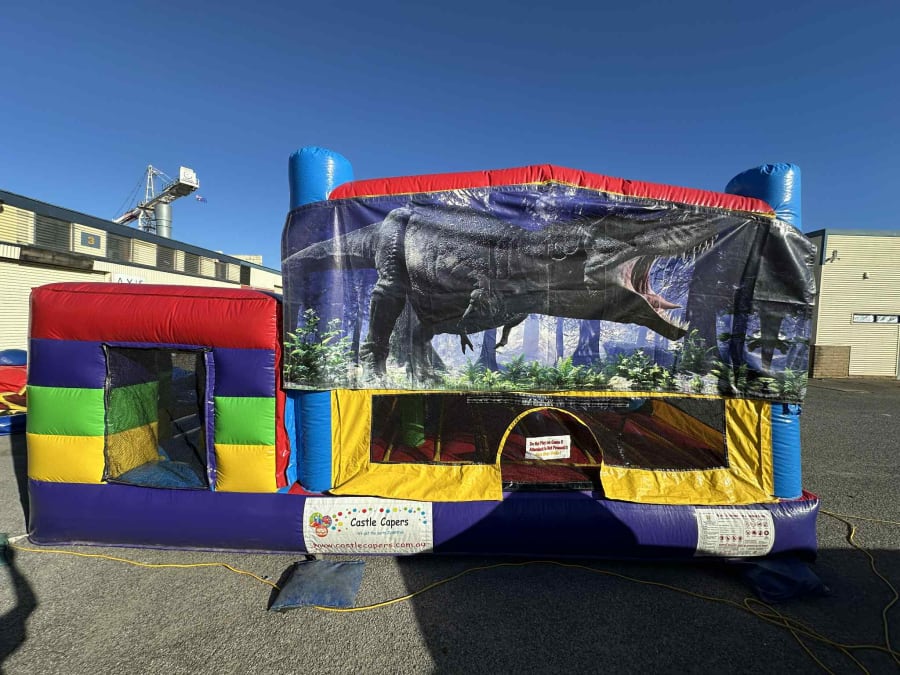 The T-Rex Multi Challenge Combo is a high-impact inflatable perfect for birthdays, school events, and OSHC programs across the Hills, Mount Barker, southern suburbs, and Murray Bridge. With pop-up obstacles, a wide jumping area, and a large slide, it delivers non-stop movement and excitement in a bold, oversized footprint.