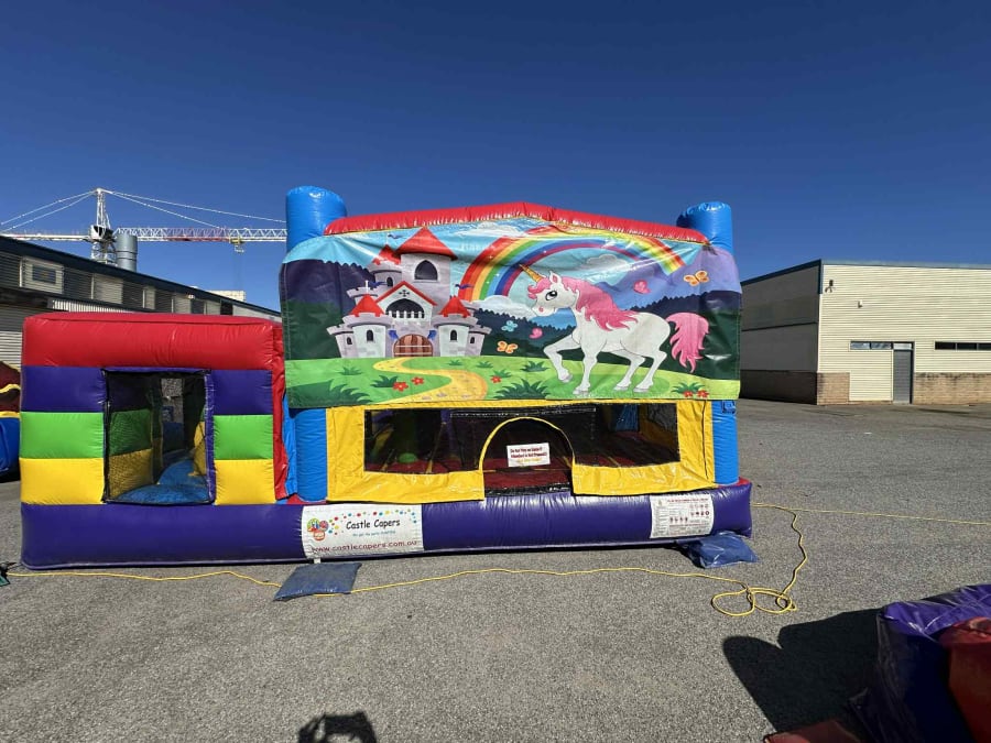 The Unicorn Multi Challenge Combo is a high-impact inflatable perfect for birthdays, school events, and OSHC programs across the Hills, Mount Barker, southern suburbs, and Murray Bridge. With pop-up obstacles, a wide jumping area, and a large slide, it delivers non-stop movement and excitement in a bold, oversized footprint.