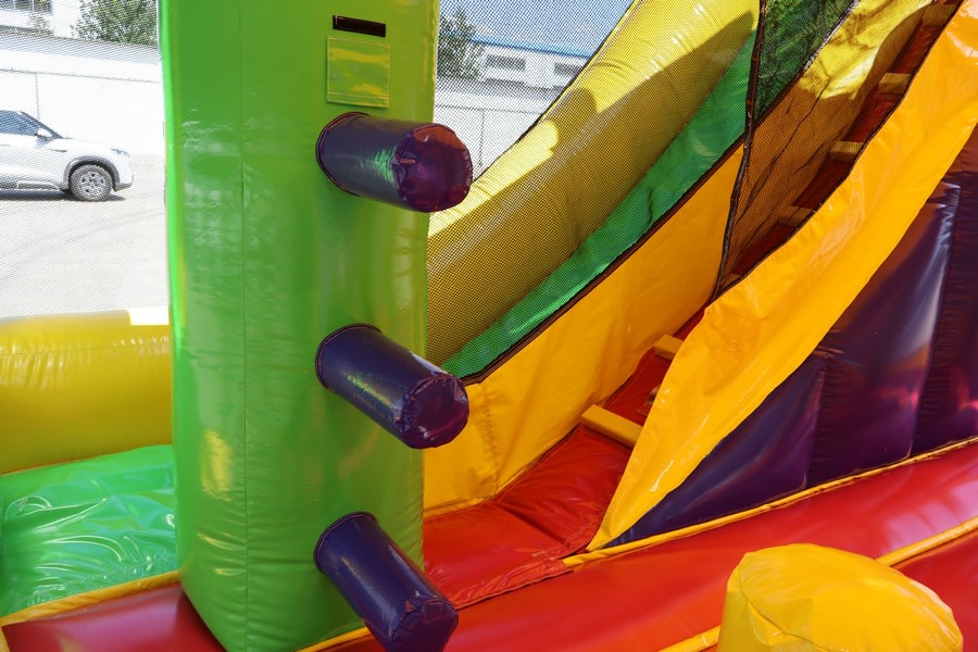 Features: Bounce area, inflated wall, inflated obstacles, stair climb, tall slide and basketball ring*.