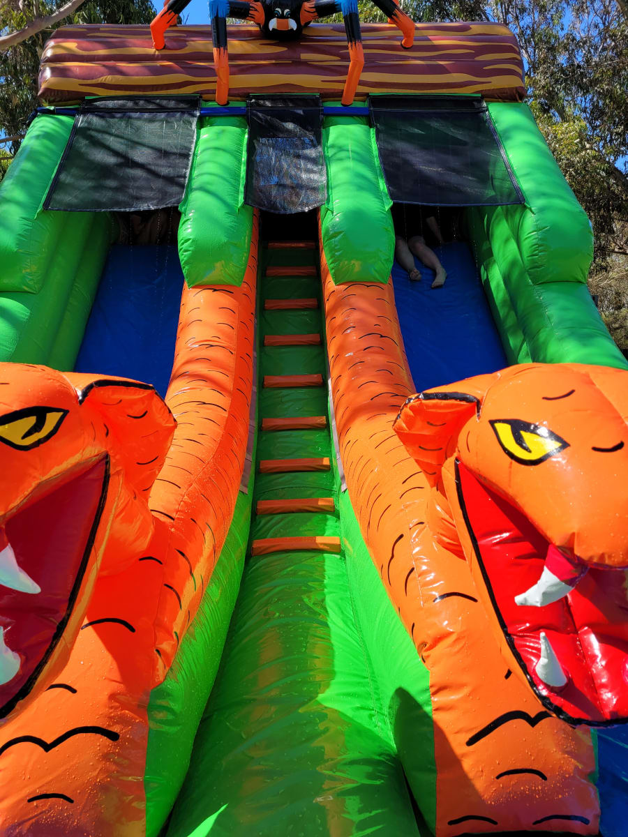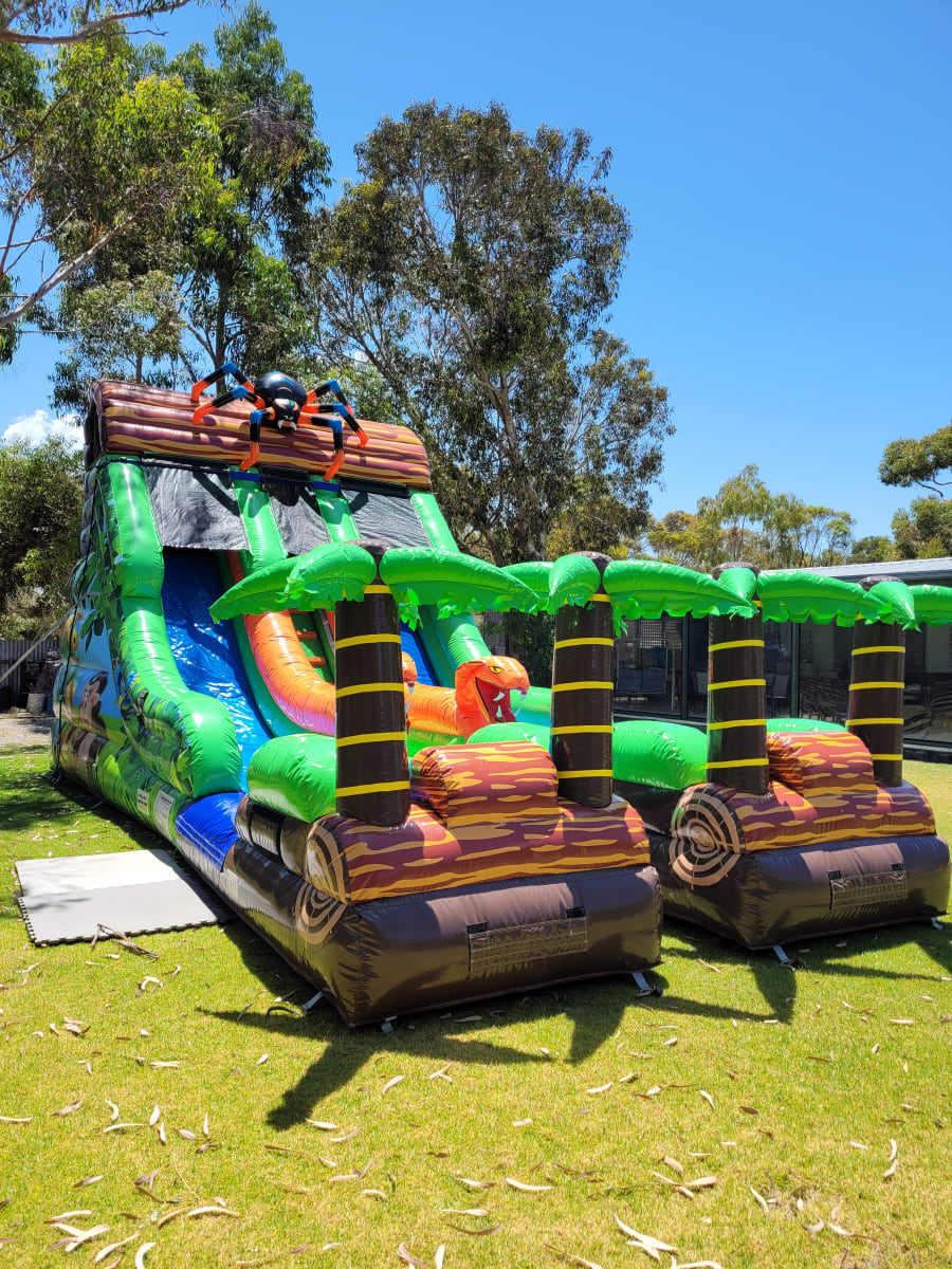 Double Lane Jungle Kingdom Water Slide Towering dual-lane slide with jungle styling, inflatable spider, and four palm trees. Built for high-impact summer events, this unit delivers serious visual punch and fast-paced fun for all ages.
