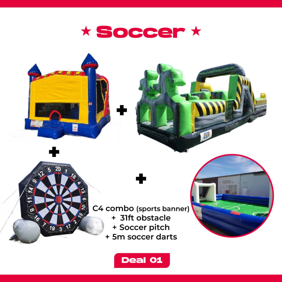 Includes a full-length inflatable obstacle course for racing and agility, a separate enclosed soccer pitch for team play, a soccer-themed C4 Combo for bounce and slide action, and Soccer Darts for precision challenges — ideal for schools and OSHCs across the Hills, Mount Barker, southern suburbs and Murray Bridge.