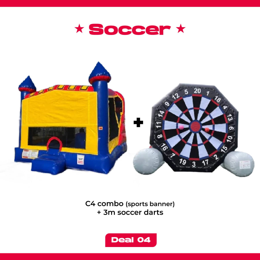 Includes our giant Soccer Darts inflatable for precision kicking challenges, plus a soccer-themed C4 Combo with bounce, climb and slide elements — perfect for younger age groups or limited space setups across the Hills, Mount Barker, southern suburbs and Murray Bridge.
