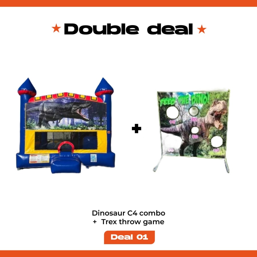 The T-Rex C4 features a bold inflatable design with bounce area, slide and basketball hoop, while the Dinosaur Throw Game adds a skill-based challenge kids love.