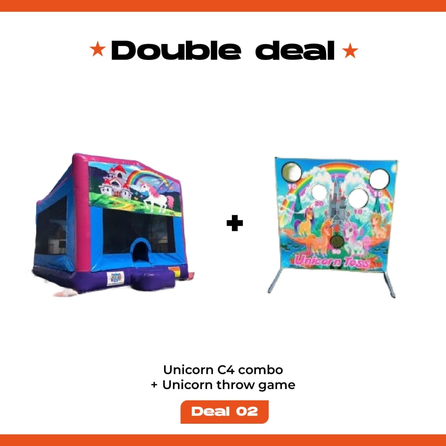 The Unicorn C4 features dreamy artwork, a bounce area, slide and basketball hoop, while the Unicorn Throw Game offers a fun challenge that fits the theme beautifully.