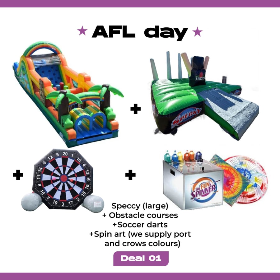 This high-energy package includes a large obstacle course, Speccy Soccer, inflatable footy darts, and a spin art station with AFL-themed colours — perfect for school events, sports days or themed vacation care.