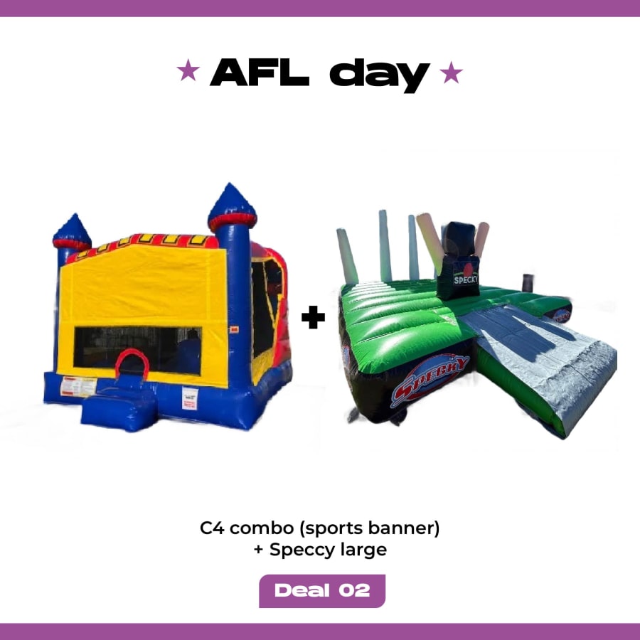 This package pairs a themed C4 Combo jumping castle (bounce area, stair climb, slide and basketball ring*) with our popular Speccy Soccer inflatable — perfect for footy-themed fun, active play and skill-building.